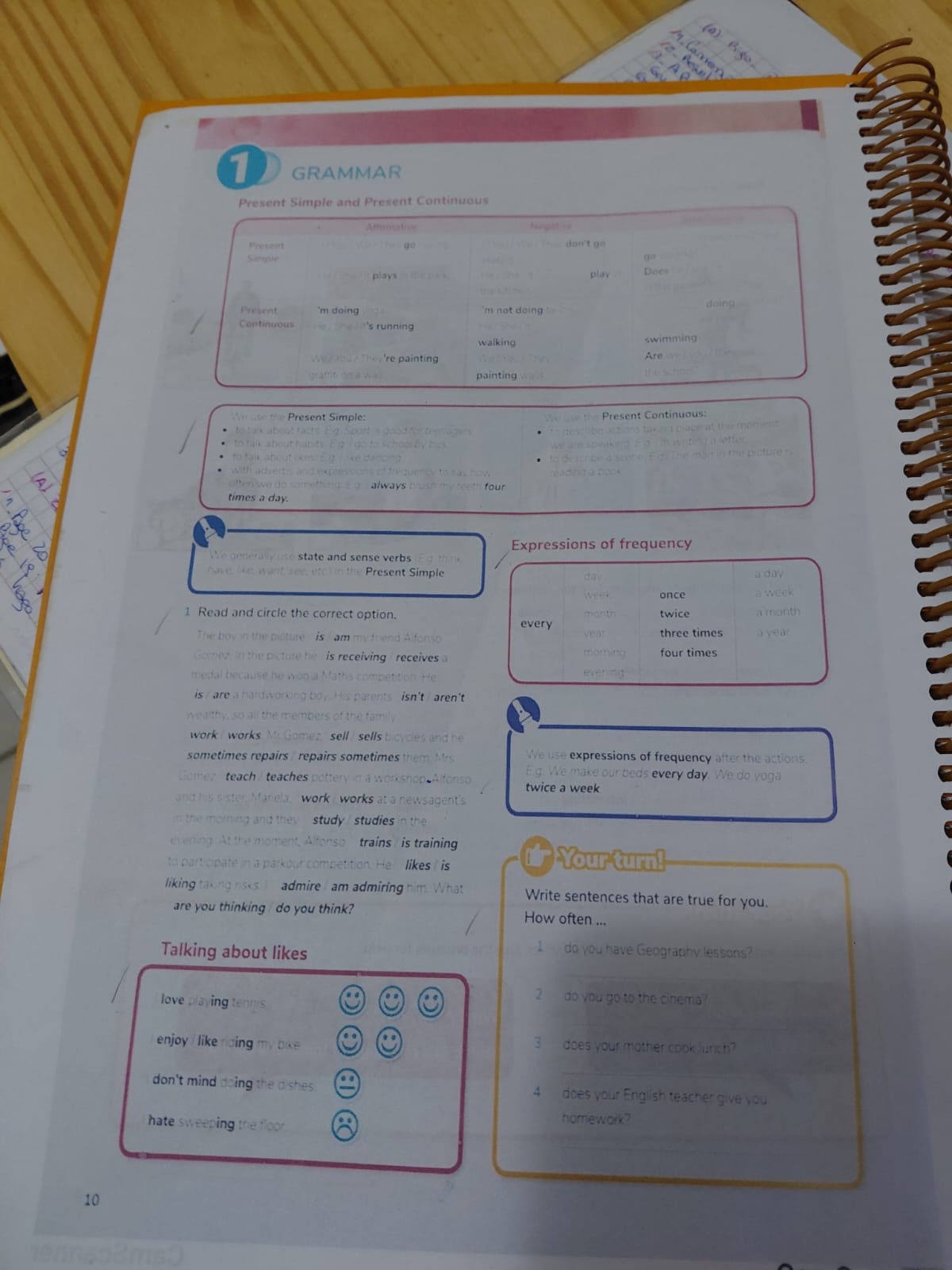 Por favor, completa el primer recuadro con los verbos auxiliares o principales que sean necesarios. Luego, ejercita con el punto 1 de la misma página y responde las 4 preguntas de YOUR TURN.